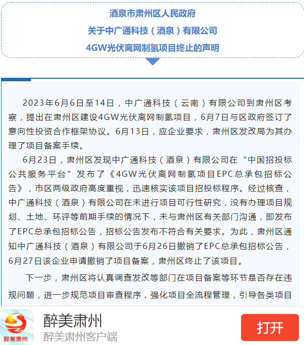 6月30日,甘肃酒泉肃州区政府发外声明:终止该项目,将讲究考核发改等部分正在项目立案等闭键是否存正在违规题目,进一步范例项目审查次第。