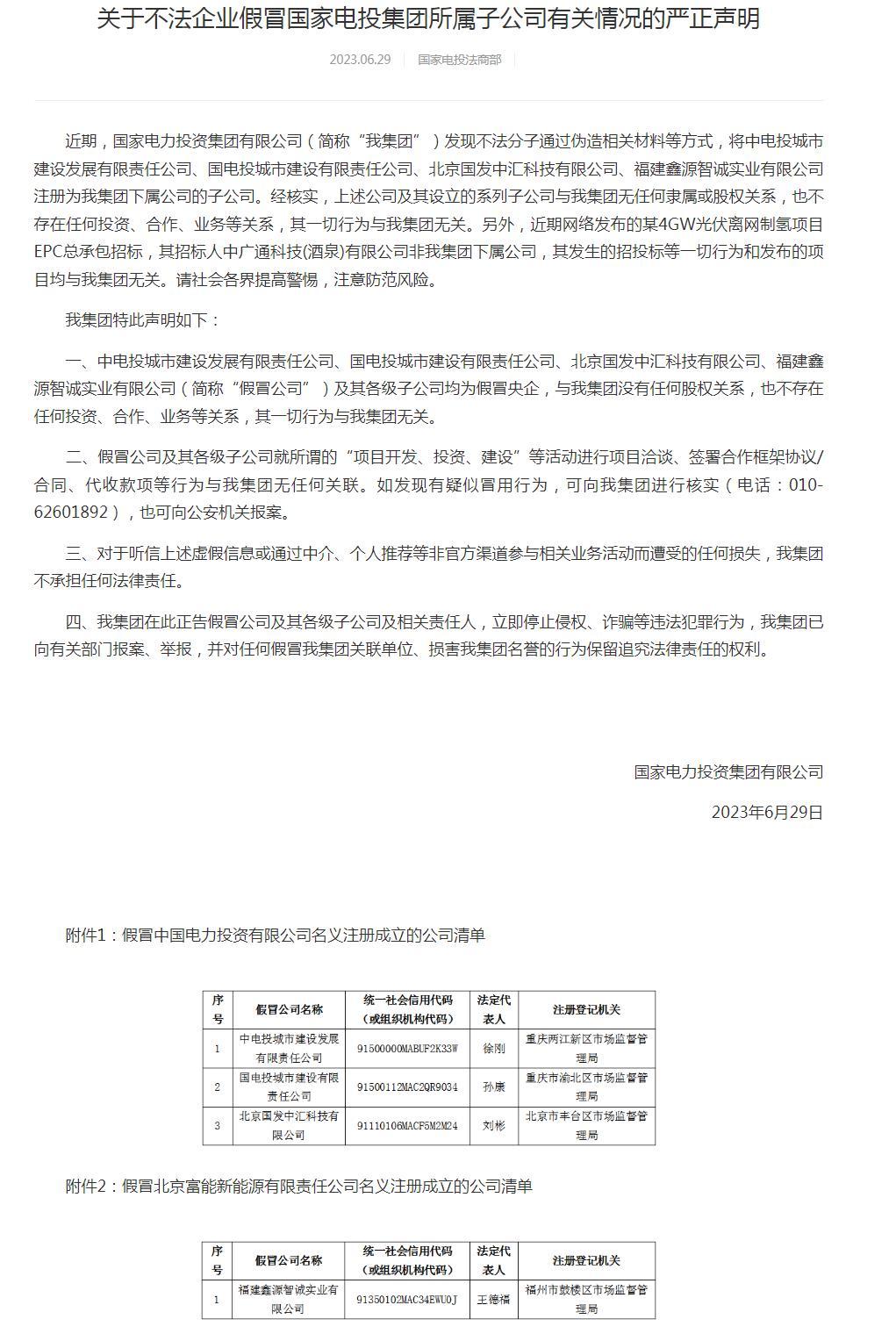 报道刊发3个小时后,邦度电投发外声明:“近期搜集发外的某4GW光伏离网制氢项目EPC总承包招标,其招标人中广通科技(酒泉)有限公司非我集团属员公司,其爆发的招投标等完全动作和发外的项目均与我集团无闭。”官方布告证明了每经的报道。