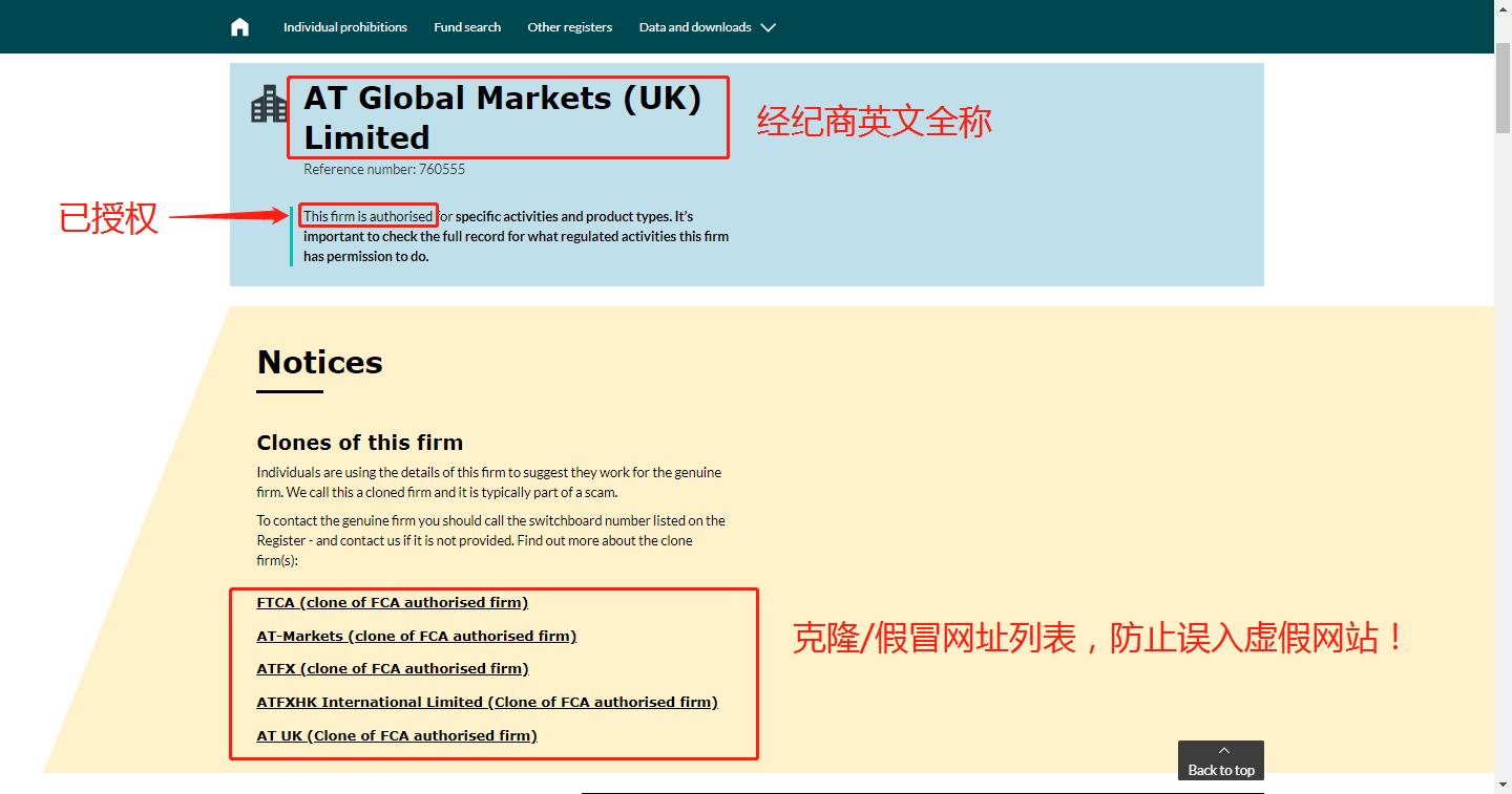 4、点开征采结果当中的经纪商名称后,会进入该经纪商的周到页面。FCA将克隆/假装网站做了周到列外,而且正在页面的最顶部做呈现,这是为了防范伪善公司恶意应用正途经纪商名称和囚禁号冒名行骗,同时指挥投资者认准正途经纪商官方网址,切勿大意。