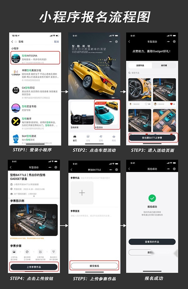 Step1:微信小步伐查找“型格”,登录“型格INTEGRA”官方小步伐平台,Step2:点击进入“车型行为”页面, 列入小步伐海选加赛比拼;Step3:正在“车型行为”页面中,点击“我也要BATTLE参赛”Step4:点击“上传参赛作品”,进入上传页面;Step5:上传参赛作品,撰写参赛宣言,并点击“提交报名”,与全体小步伐渠道参赛的选手举行人气与能力的PK