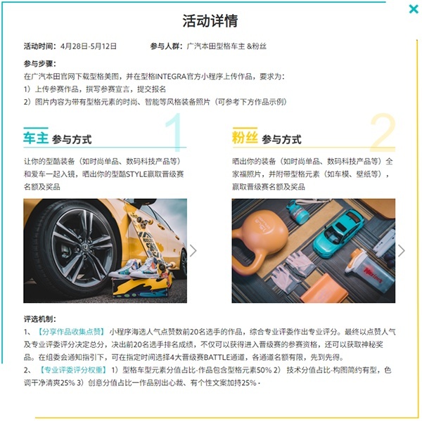 海选赛几近尾声,为了知足粉丝们的参赛热中,4月28日-5月12日,广汽本田型格)将怒放海选赛加赛通道,用户可登录官方小步伐“型格INTEGRA”揭晓作品,掠夺特殊20个有奖晋级名额。