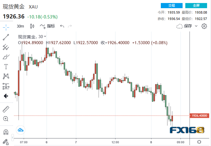 美市盘中,现货黄金继续下跌并改正日低至1922.57美元/盎司,较日高回落近16美元。
