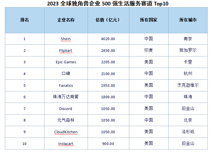 2023环球独角兽企业500强生计办事赛道Top10的企业分辨是Shein、Flipkart、Epic Games、口碑、Fanatics、珠海万达商管、Discord、元气丛林、CloudKitchen、Instacart。个中,Shein的估值为4620.00亿元,正在生计办事赛道排名第1,总榜排名第4位;Flipkart的估值为2450.00亿元,正在生计办事赛道排名第2,总榜排名第9位;Epic Games的估值为2205.00亿元,正在生计办事赛道排名第3,总榜排名第11位;口碑的估值为2100.00亿元,正在生计办事赛道排名第4,总榜排名第13位;Fanatics的估值为1953.00亿元,正在生计办事赛道排名第5,总榜排名第20位;珠海万达商管的估值为1800.00亿元,正在生计办事赛道排名第6,总榜排名第21位;Discord的估值为1050.00亿元,正在生计办事赛道排名第7,总榜排名第38位;元气丛林的估值为1050.00亿元,正在生计办事赛道排名第8,总榜排名第38位;CloudKitchen的估值为1050.00亿元,正在生计办事赛道排名第9,总榜排名第38位;Instacart的估值为900.00亿元,正在生计办事赛道排名第10,总榜排名第51位。