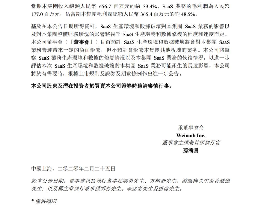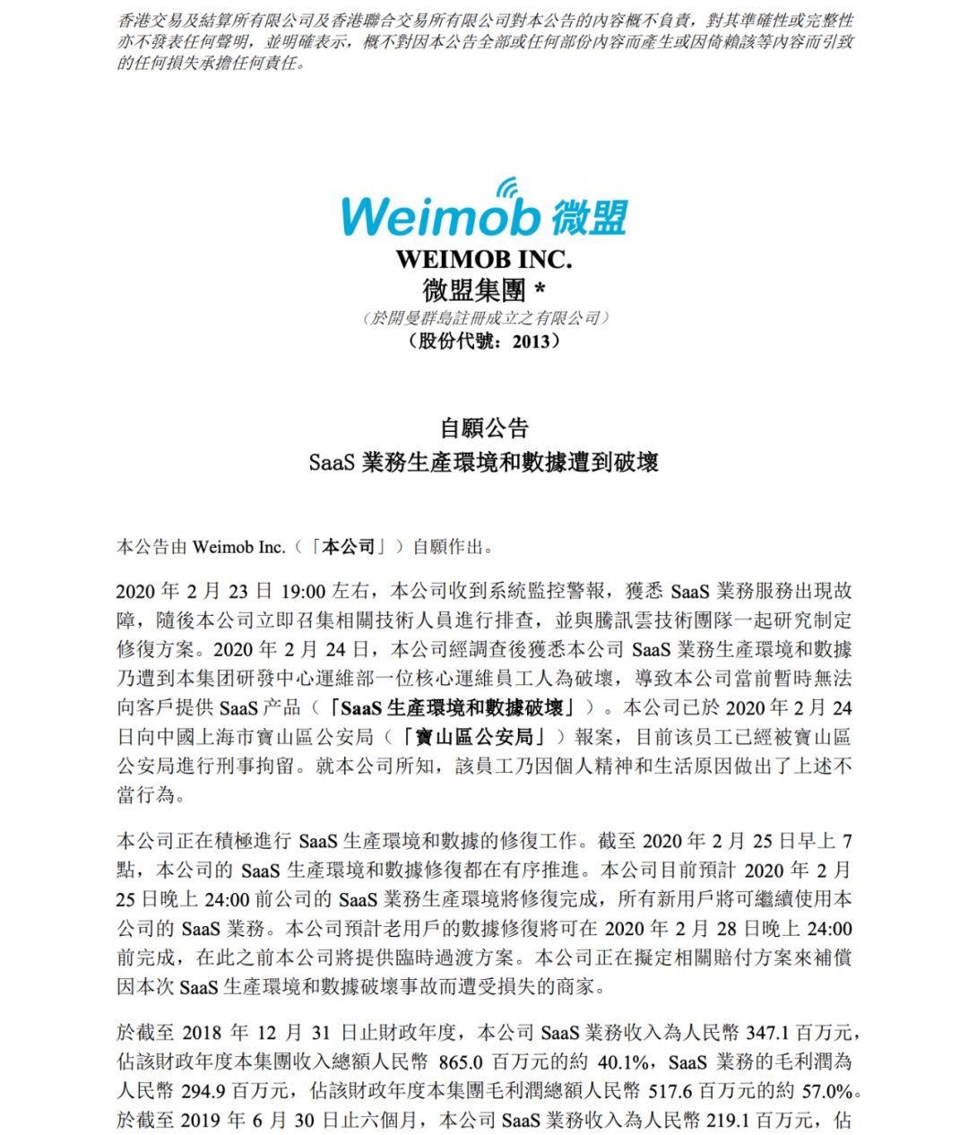 2020 年 2 月 23 日 19:00 阁下,本公司收到体例监控警报,获悉 SaaS 营业供职闪现阻滞,随后本公司顿时凑集闭联时间职员举行排查,并与腾讯云时间团队沿途讨论拟订修复计划。2020 年 2 月 24 日,本公司经视察后获悉本公司 SaaS 营业坐褥处境和数据乃遭到本集团研发中央运维部一位重点运维员工人工捣乱,导致本公司目下权且无法向客户供应 SaaS 产物(「SaaS 坐褥处境和数据捣乱」)。本公司已于 2020 年 2 月 24日向中邦上海市宝山区公安局(「宝山区公安局」)报案,目前该员工曾经被宝山区公安局举行刑事拘押。就本公司所知,该员工乃因一面精神和生存理由做出了上述不妥举动。