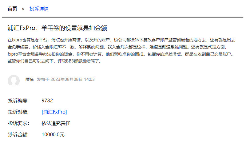 近期有效户反应,浦汇FxPro平台滑点离谱,还私自窜改客户账户禁锢,是何如一回事?据斑马投诉用户反应:浦汇FxPro也算是老平台,滑点也起头离谱,以及开的账户,该公司都市私自窜改客户账户禁锢到最差的地方去,另有即是出去金免手续费,价钱入金跟汇率不相同,解说编制题目,我入金几次...