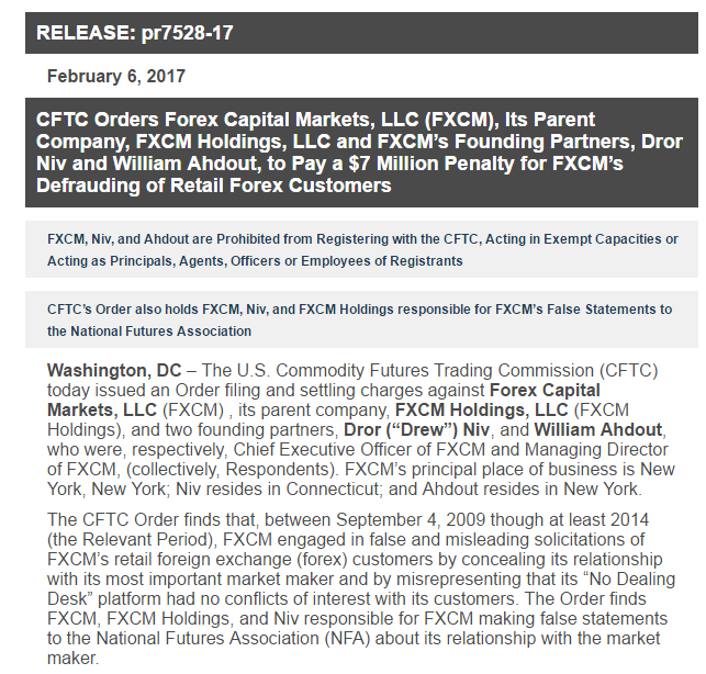 CFTC信息稿称,正在2009年9月4日至起码2014年岁月,福汇通过遮掩与其最要紧做市商的合连,以及通过诬蔑其“No Dealing Desk”平台与其客户没有益处冲突的方法,针对零售(外汇)客户保存子虚及误导性地陈述。 CFTC还创造,福汇、福汇控股公司(FXCM Holdings)和福汇的首席奉行官Drew Niv向全邦期货协会(NFA)做出合于其与做市商合连的子虚陈述。