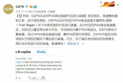诸君网友,很缺憾地报告大师,因为版权原由,CGTN无法对刘欣与FOX贸易频道主播翠西里根(Trish Regan)合于中美营业的对话举行直播。此次对话正在FOX贸易频道播出,刘欣仅以嘉宾身份到场节目,节目版权归属于FOX电视台。CGTN蓝本谋划直播,过程与FOX贸易频道疏导,最终未取得节目授权。CGTN不行正在没有取得对方授权的境况下私行举行直播。可是,为了餍足诸君网友的音讯需求,咱们会对其举行及时报道。敬请期望!