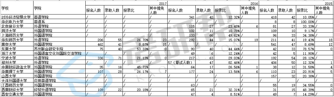 报录比响应了该校英语笔译专业的竞赛水准,报录比越低,显示考生对该校英语笔译专业的竞赛越激烈。考生正在择校时,要遵照自己的本质环境和院校的报录比,当心采取,切勿盲目探求热门学校。若该院校当年未揭橥报录比,则标注为“/”。