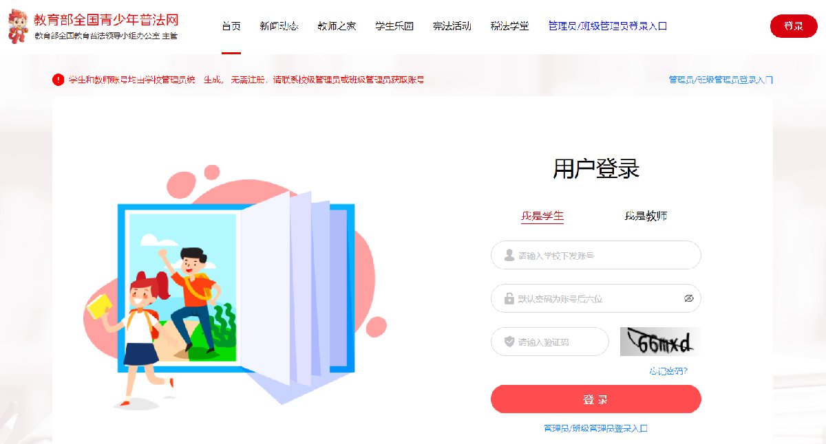 学生可进入训导部全邦青少年普法网官网,点击右上角“登录”进入全邦青少年普法网登录平台。学生和西席账号均由学校拘束员同一天生, 无需注册,请联络校级拘束员或班级拘束员获取账号。