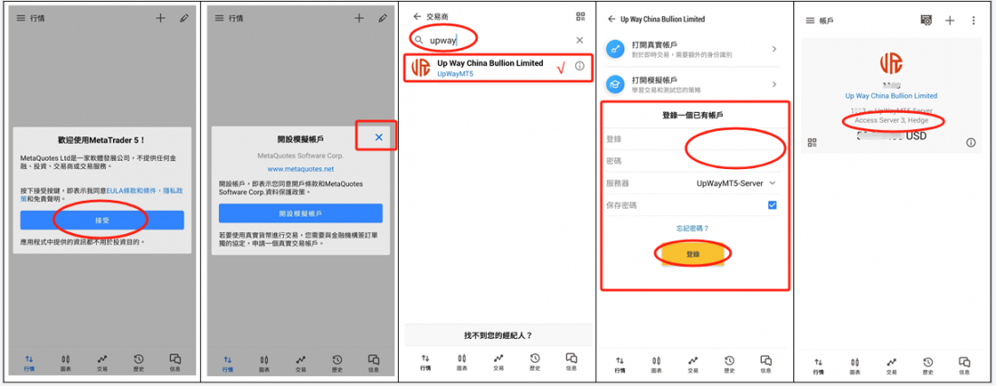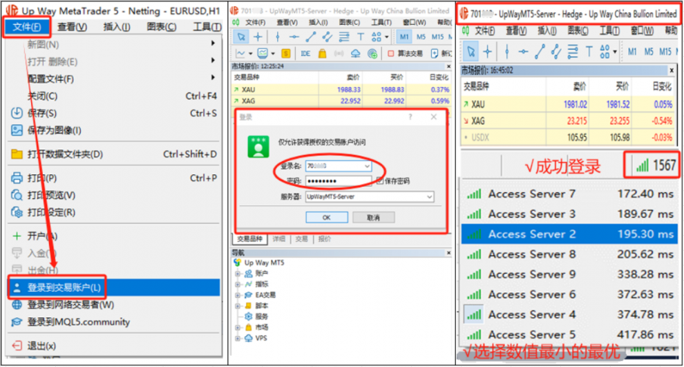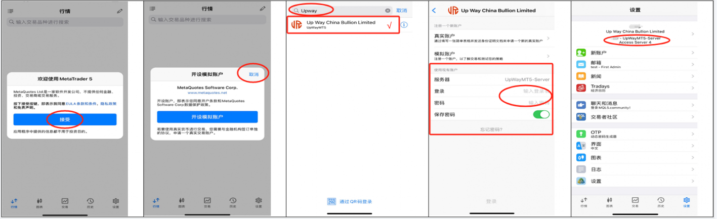2、输入来往账户和来往暗码,供职器默认【UpWayMT5-Server】点击【OK】登录账户;