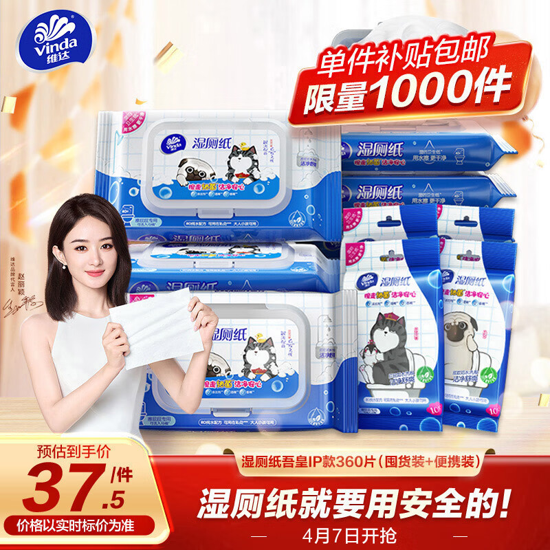 维达(Vinda)湿草纸 组合装360片(40片8包+10片4包) 吾皇洁厕湿纸巾 擦走细菌