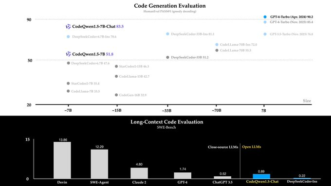 CodeQwen1.5 闪现出了杰出的代码天生、长序列筑模、代码删改、SQL 本领等。