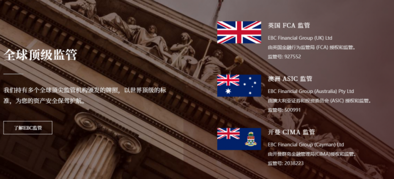 以我正正在来往的EBC平台为例,他具有三大顶级羁系执照,英邦FCA的羁系号是927552,澳洲ASIC的羁系号是500991,开曼CIMA的羁系号是2038223,每一个执照都有羁系号。