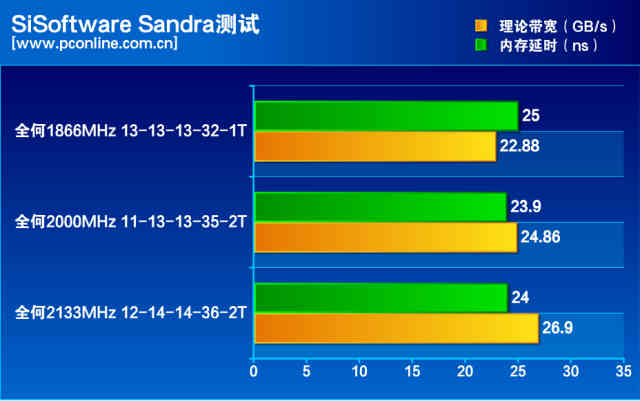 编辑点评:内存带宽是CPU与内存操纵器之间的“桥梁”,带宽越大,数据的传输速率就越速。全何Vulcanus 1866MHz正在双通道的搭筑下,默认1866MHz形态下的内存带宽就能抵达22.88 GB/s,但咱们将该套内存超频至2133MHz形态下,该内存带宽依然抵达26.9GB/s,可与其他默认频率正在2133MHz的内存一较高下。而内存延时方面,从默认1866MHz形态到超频至2133MHz,它的内存延迟缩短了1ns。