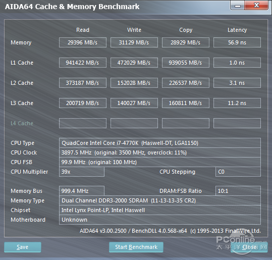 内存延时与带宽测试(全何2000MHz 11-13-13-35-2T)
