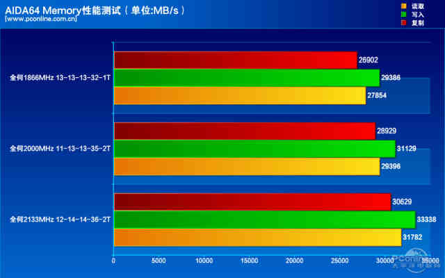 测试小结:正在AIDA 64内存机能测试中,全何Vulcanus内生存默认的1866MHz频率下,读/写/复造的传输速率抵达了27854/29386/26902 MB/s,机能与主流1866MHz内存比拟稍好些。正在跟着内存频率的逐渐进步,整个读/写/复造机能上升显明。正在超频抵达2133MHz的高频率下,全何Vulcanus 1866MHz读/写/复造机能高达27854、29386、26902 MB/s,机能发扬不俗。