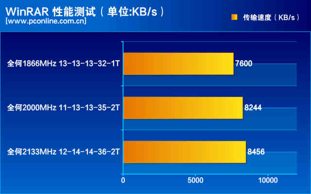 编辑点评:全何Vulcanus 正在默认1866MHz形态下的解压速率为7600 KB/s;正在超频至2133MHz后,其解压速率为8456 KB/s。内存频率的晋升淘汰了压缩文献所需用时刻。