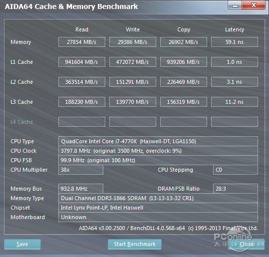 内存延时与带宽测试(全何1866MHz 13-13-13-32-1T)