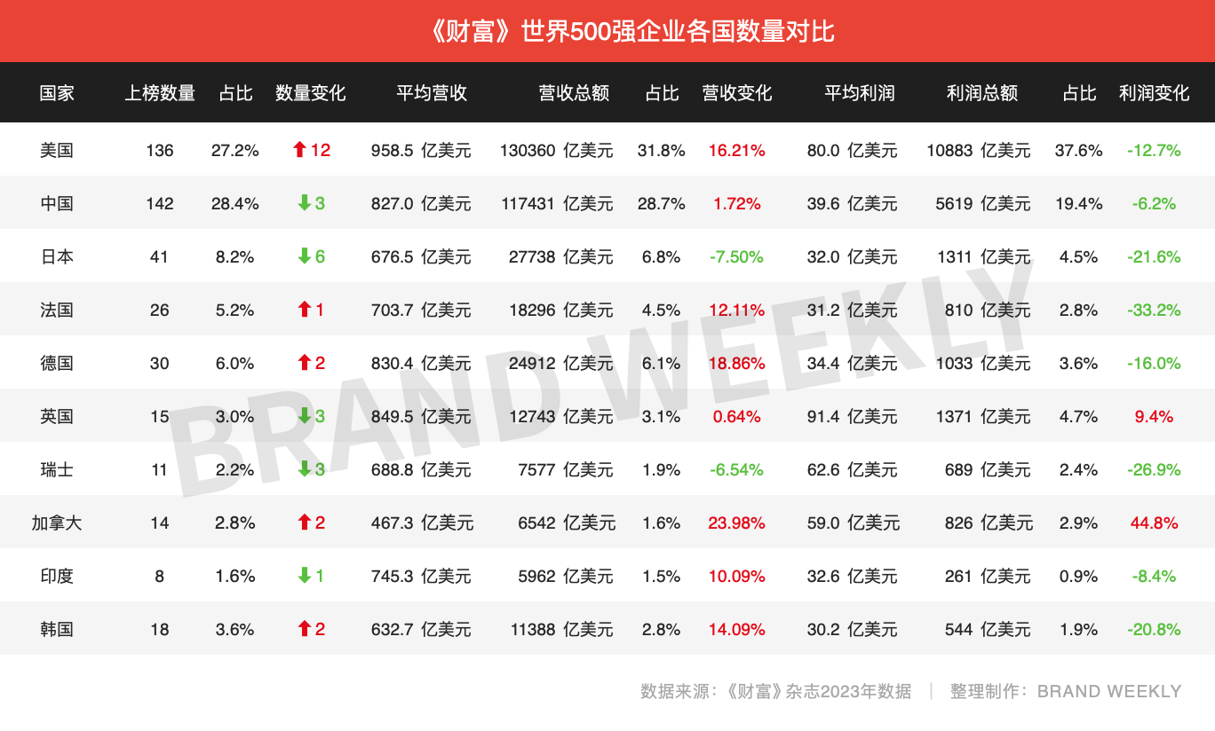 一目了然,《资产》宇宙500强企业排行榜是目前量度宇宙上大型企业的最知名、最巨头、最方便粗暴的榜单,遵照企业的年度开业收入排名,平凡操纵于企业传扬本身的谋划景遇。遵照《资产》杂志发表的2023年宇宙500强企业榜单数据,上榜门槛从286亿美元跃升至309亿美元,500家公司的营收总和约为41万亿美元,比上年上涨8.4%。不过,受环球经济下行影响,本年一切上榜公司的净利润总和同比节减6.5%,约为2.9万亿美元。