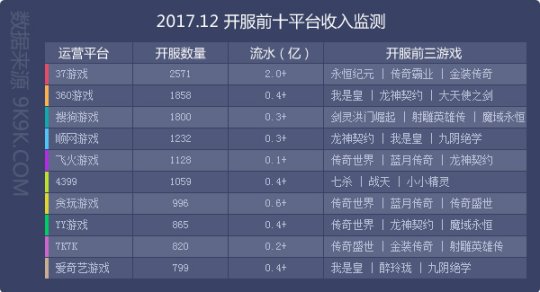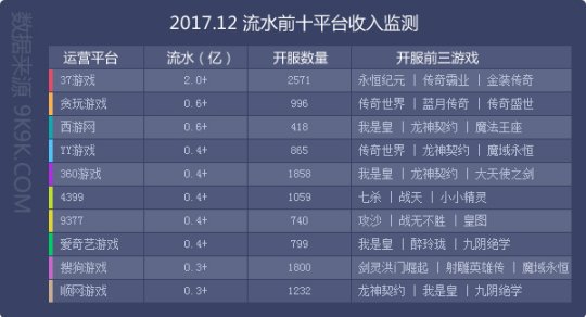 点评:本月开服前十平台流水较上月蜕变不大,37逛戏接连以较大上风领跑榜单,旗下新增吸金热门《永世纪元》,本月显示不俗。其余各平台开服战略未发作明显蜕变,流水收益方面也较为安闲,震撼不大。