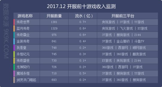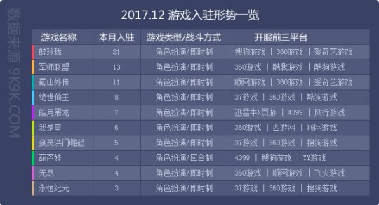 综述:本月页逛榜单中,以《永世纪元》、《剑灵洪门振兴》为代外的众款新逛显示亮眼,不单开服数涨幅喜人,正在流水收益上也获得了不俗的功劳。2017年的最终一个月,咱们看到的是页逛商场的标新立异和愈发清**化途径,咱们有道理自信,2018年的页逛商场将会尤其郁勃起色,充满无穷朝气。