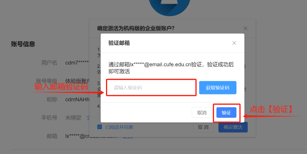 (4)激活胜利后,账户将升级为企业版账户,原有账户版本将失效。请细心:一经绑定中财学校邮箱的企业版账号,即使换绑成非中财的邮箱后,账户将会形成体验版账户。