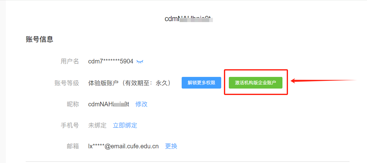 (2)绑定或换绑为中财的学校邮箱后,可正在【账号品级】右侧看到【激活机构版企业版账户】按钮。