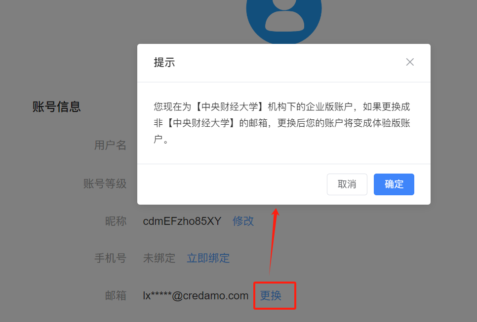 (1)一经注册过Credamo睹数的师生,可登录网站后,正在【私人音信】-【账号音信】中绑定或换绑为学校邮箱实行激活和升级。即使一经绑定了非中财的邮箱,可点击【更调】为中财的邮箱。即使没有绑定邮箱,可点击【顷刻绑定】,绑定中财的学校邮箱。