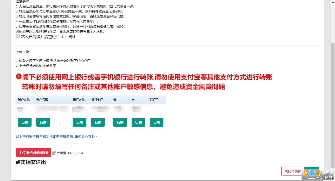 入金须知画面或者会有差异,是以请以当时您入金的时分显示的为准。若无误,请点击【确定】-【提交】按钮。接着请正在“自己已阅读并清晰理会以上细则”打勾,接着点击“理会”进入付款流程。