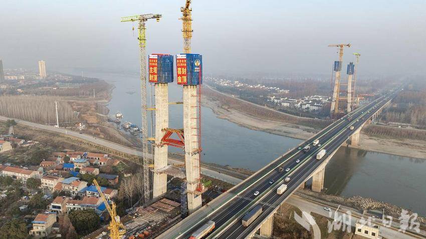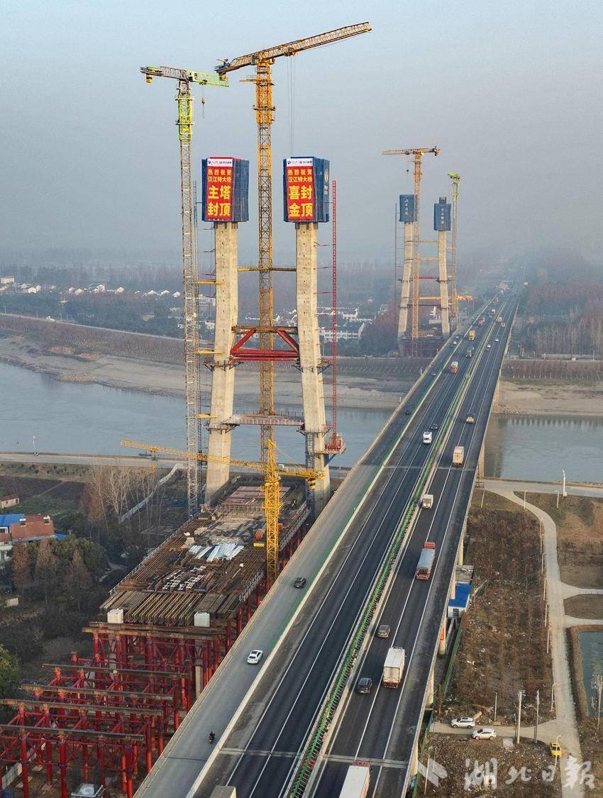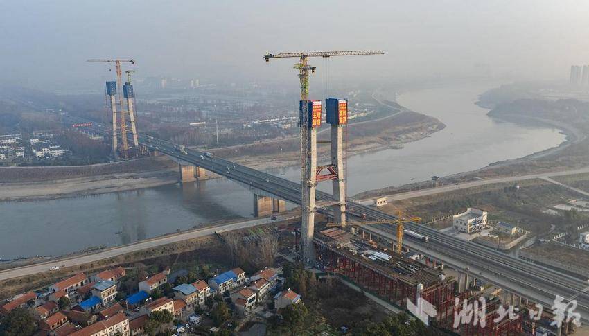 1月12日,京港澳高速新汉江特大桥主塔封顶。(湖北日报全媒记者 柯皓 摄)