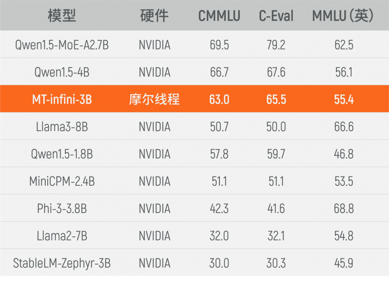 MT-infini-3B模子操练总用时13.2天,颠末精度调试,达成全程平静操练延续绝,集群操练平静性到达100%,千卡操练和单机比拟扩展服从高出90%。目前,实训出来的MT-infini-3B本能正在同范围模子中跻身前哨,比拟正在邦际主流硬件上操练而成的其他模子,正在C-Eval,MMLU,CMMLU等3个测试集上均达成本能领先。