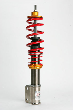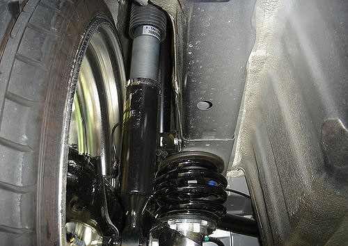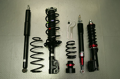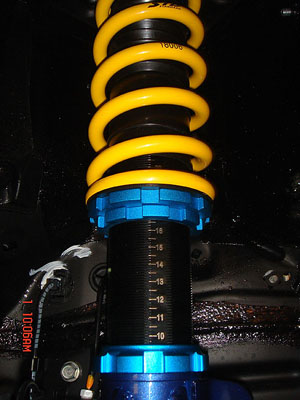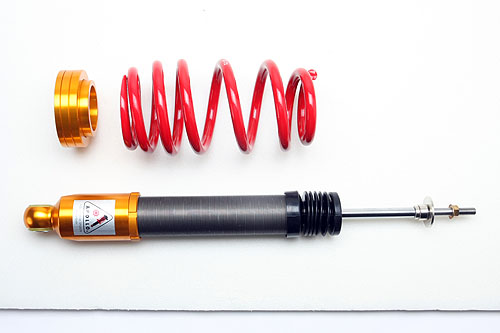 图中左为原厂避震器,右为BC避震器,看得出原厂弹簧直径大、行程长,属于惬意类型,BC直径小、行程短,因此响应疾、维持力强,运动性较佳。