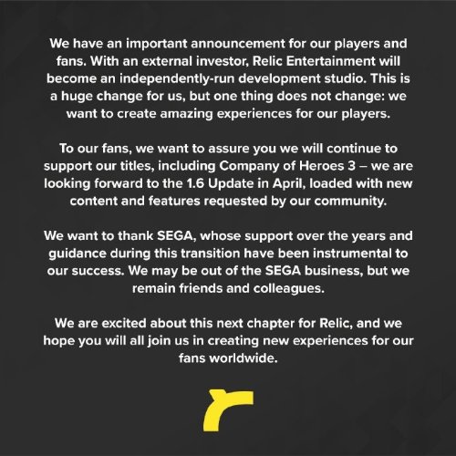 依照Relic官方的说法,Relic正在获取了外部投资之后,将转为一个独立的职责室运营,不再是世嘉集团的逐一面。