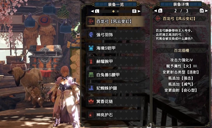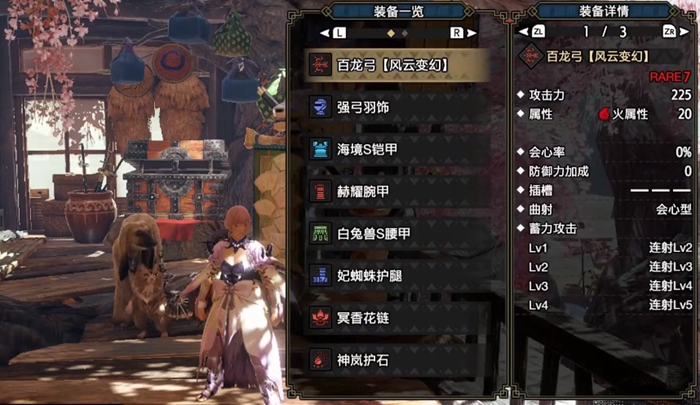 军器选用的是百龙弓风云变,百龙插槽利用的分手是攻击力加强四级、火属性三级、打算类型蜕变为连射、追巩固击瓶及减气瓶、蜕变曲射为会意型。