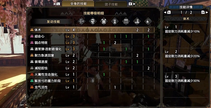 最初来看看这套配装的技巧,体术4级以及2级耐力急速回答进一步巩固咱们耐力删除的量以及规复速率,3级超会意以及3级弱点殊效进一步擢升咱们的暴击率以及暴击蹂躏,连射箭加强3级包管了咱们连射箭的蹂躏,1级蓄力解放可能让弓的攻击成果进一步擢升。