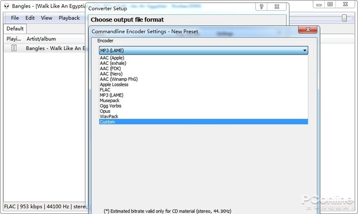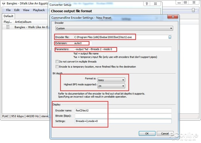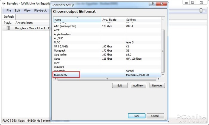 接着会弹出一个自界说转换配置的窗口,正在这里咱们必要配置输出方式为fooCDtect,让fooCDtect这个无损审定插件接受Foobar 2000的音频方式转换器。点击“Output format”进入闭联配置。