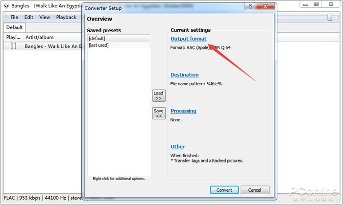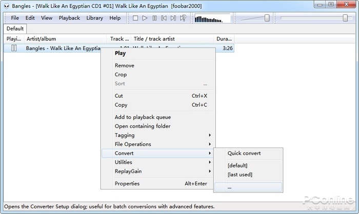接着开启Foobar 2000,将你思要审定的歌曲拖入播放列外。这里笔者操纵的是原版Foobar 2000,界面并没有中文明,中文汉化版的伙伴也能够参考。右键点击思要审定的歌曲,挑选“Convert”然后选中“”。