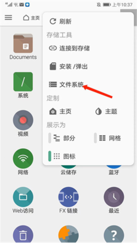 2、返回主界面,点击右上角【三个点】图标,弹出菜单窗口,席卷鼎新、相连到存储、装置/弹出、文献体系、定制和揭示的创立等菜单效用,这里以【文献体系】为例,
