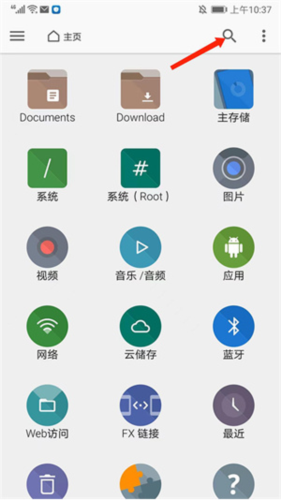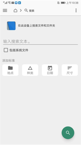 1、掀开fx文献统制器中文版,进入运用主界面,抉择右上角【放大镜】图标,能够输入文本和增加地址、品种、日期尺寸等条款来寻求目今摆设上的文献和文献夹,
