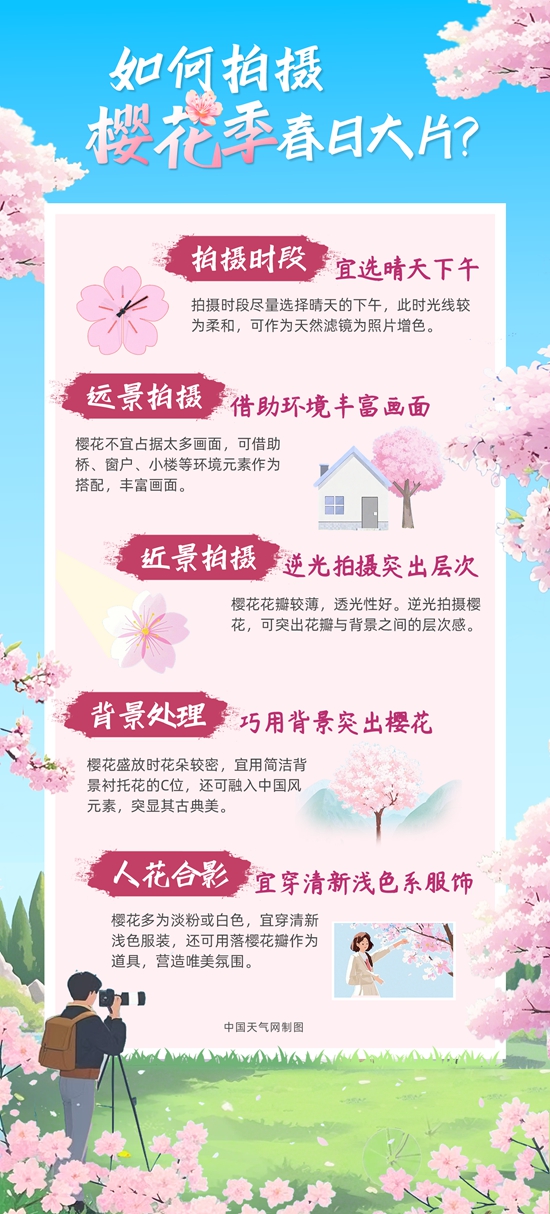 樱花盛放灿若云霞,但花季却极端短暂,照相是留住樱花之美的绝佳伎俩之一。若何捉拿樱花的方针感?人花合影若何营制浪漫气氛感?中邦气象网从景别、构图、拍摄时段等方面总结了拍摄小贴士,助你拍出绝美春日大片。