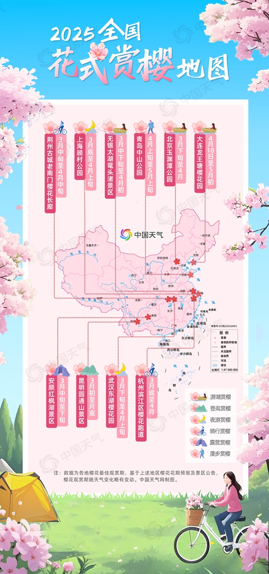 从中邦气象网推出的2025寰宇花式赏樱舆图来看,3月初樱花花事已开启,截至目前长江以南区域的樱花已一连迎来盛花期,北方3月底至4月初也将一连进入樱花赏玩期。樱花季准期而至,赏樱办法愈发众元。守旧的逛湖、登高、信步赏樱依然备受青睐,夜逛、骑行、露营等赏樱办法也各具特征,成为人们赏樱的新选拔。