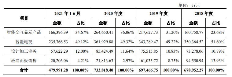 申报稿显示,2018年至2020年及2021年上半年(下称“申诉期”),公司告终买卖收入68.52亿元、70.31亿元、74.14亿元、48.38亿元,对应净利润阔别为3.96亿元、5.31亿元、4.85亿元、2.51亿元。个中,智能交互显示产物及智能电视功绩了首要收入。