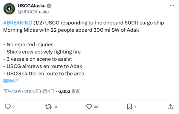 海岸警戒队陈述称,目前已派出空中机组职员和一艘巡缉舰协助经管境况,现场已有三艘船只。