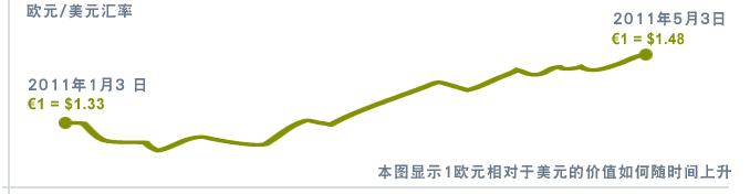 举例说,于2011年1月3日,1欧元约值1.33美元。于2011年5月3日,1欧元约值1.48美元。正在这段时分,欧元相对付美元的代价上升了约10%。