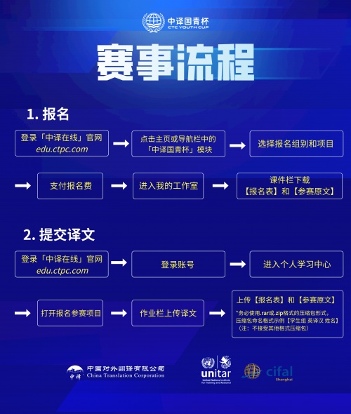 参赛者可于2022年5月18日-7月20日,登录中邦对外翻译有限公司“中译正在线”官方网站,点击“中译邦青杯”邦际构造文献翻译大赛模块或导航栏的“中译邦青杯”报名参赛。