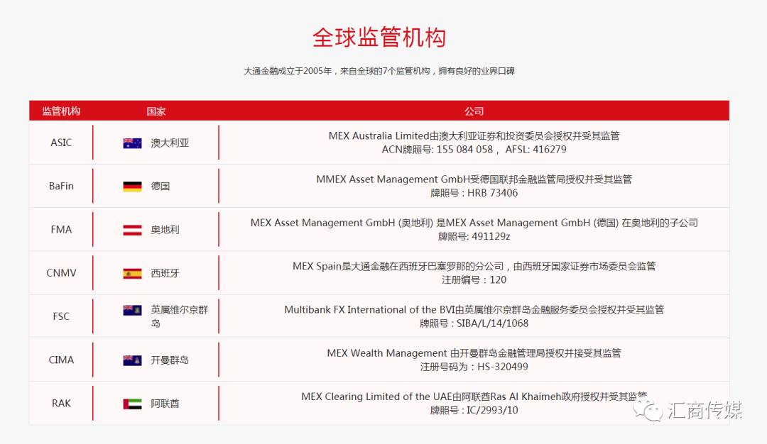 别的,MEX大通金融正在环球畛域内给与庄厉的金融监禁,征求澳大利亚证券与投资委员会(ASIC)、德邦联邦金融监禁局(BaFin)、英属维尔京群岛金融任事委员会(FSC)、开曼金融照料局(CIMA)及其他监禁机构。