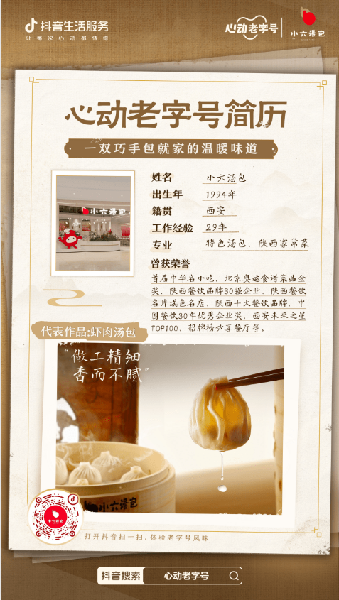 2022年6月抖音开团,小六汤包碰到了“对的人”,单月生意额增加凌驾20倍;春节套餐吸引近500位博主自觉打卡,播放量破1300万。此次「心动老字号」岁月,一口吻上架近十款团购,已售出5万份。小六汤包依然出了名的“珍视内正在”,系列原创短片《芳华终结》《好好爱本身》《及早孝敬》,做到内馅暖胃,实质暖心。