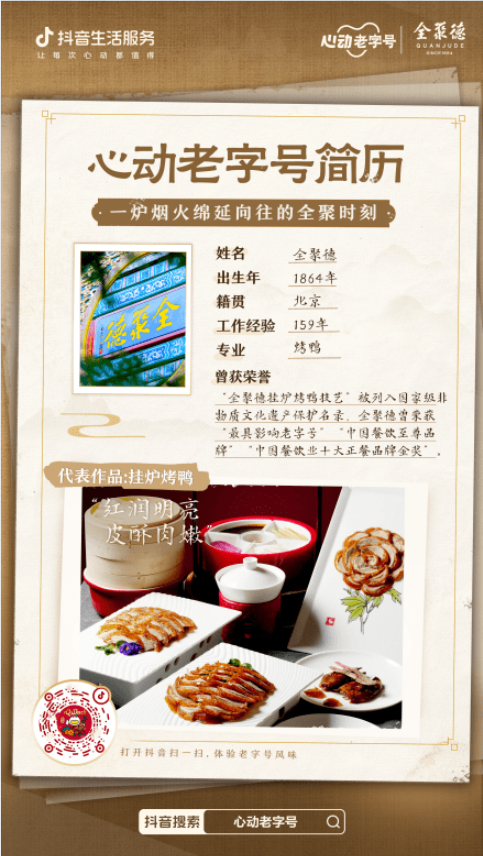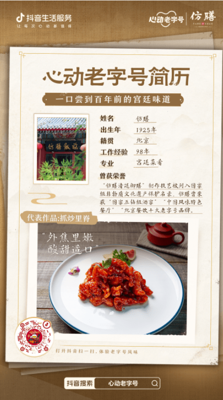 正在「心动老字号」IP中,全聚德、仿膳、点都德、小六汤包等众家老字号率先亮出了“超有范儿”的简历。不只有动辄百年的“职业体验”,更直接用作品措辞,正在抖音玩起了“赛博上菜”:挂炉烤鸭、抓炒里脊、金莎海虾红米肠、虾肉汤包等众道招牌菜逐一出镜。“馋哭了,迩来的门店正在哪里,我曾经正在途上了”等众条“喊饿”评论成绩高赞。