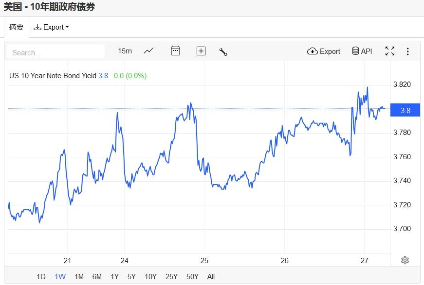 美债收益率正在仍具韧性的美邦经济数据发布后团体拉升,基准的10年期美债收益率收报3.8%;对货泉策略更敏锐的两年期美债收益率收报3.637%。