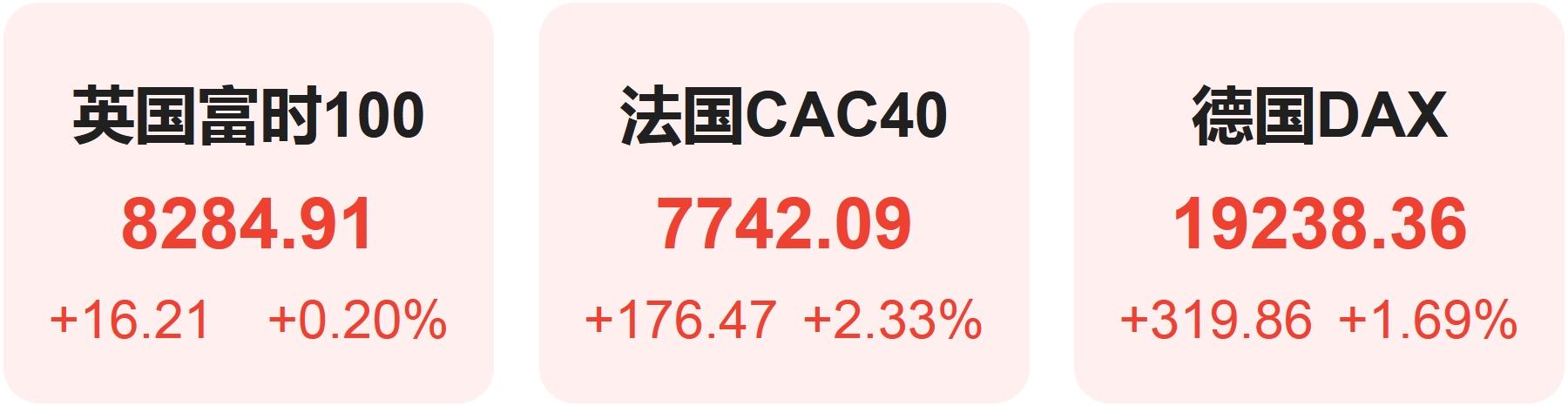 欧洲股市方面,英邦富时100指数小幅上涨0.20%,报8285点。法邦CAC40指数大涨2.33%,报7742点。德邦DAX指数上涨1.69%,报19238点。